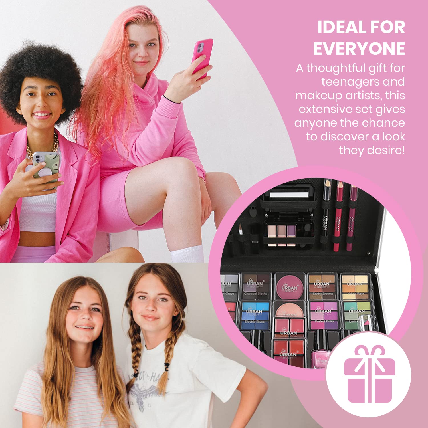 Questo superbo astuccio per il trucco rosa caldo è dotato di 82 prodotti di bellezza progettati per sfidarvi a trovare il vostro stile. Provate colori, texture e tecniche diverse e scoprite cosa funziona davvero per voi. Alla fine, tutto ciò che conta è divertirsi e godersi i primi passi nel mondo del trucco. Il vanity case rosa caldo è super elegante e chic, oltre che adatto ai viaggi, per avere sempre un aspetto favoloso.