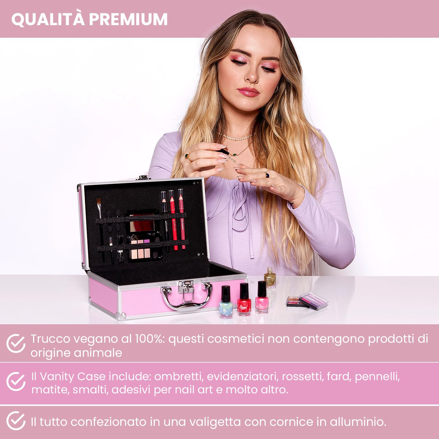 • Tutti i cosmetici contenuti in questa valigetta sono 100% vegani