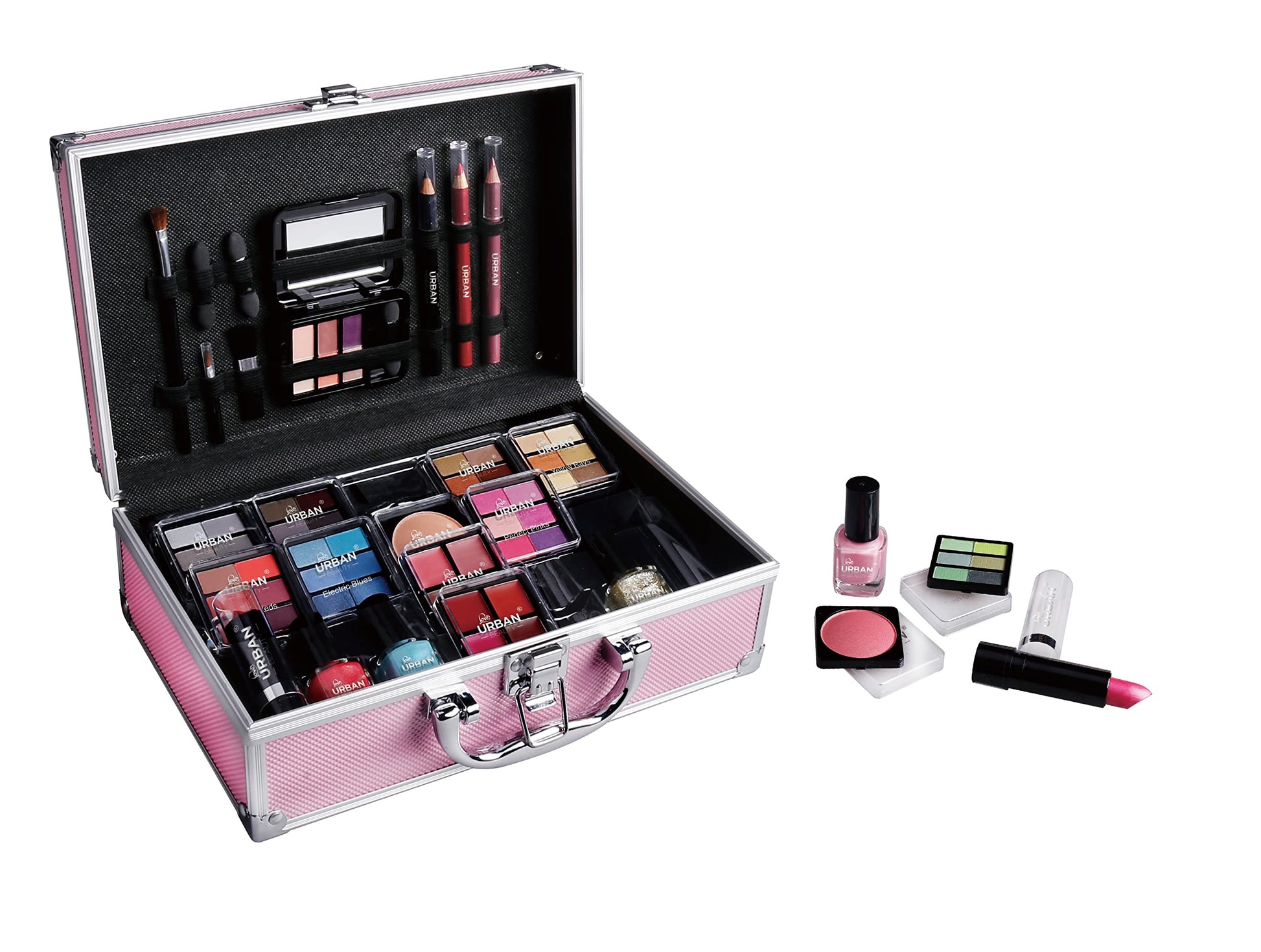 LOVE URBAN BEAUTY Vegano Beauty Case Rosa Caldo - Kit Trucco 82 pezzi per Ragazze e Donne con Ombretti, Fard, Rossetti e Prodotti per le Unghie - Divertente Valigetta da Trucco da Viaggio