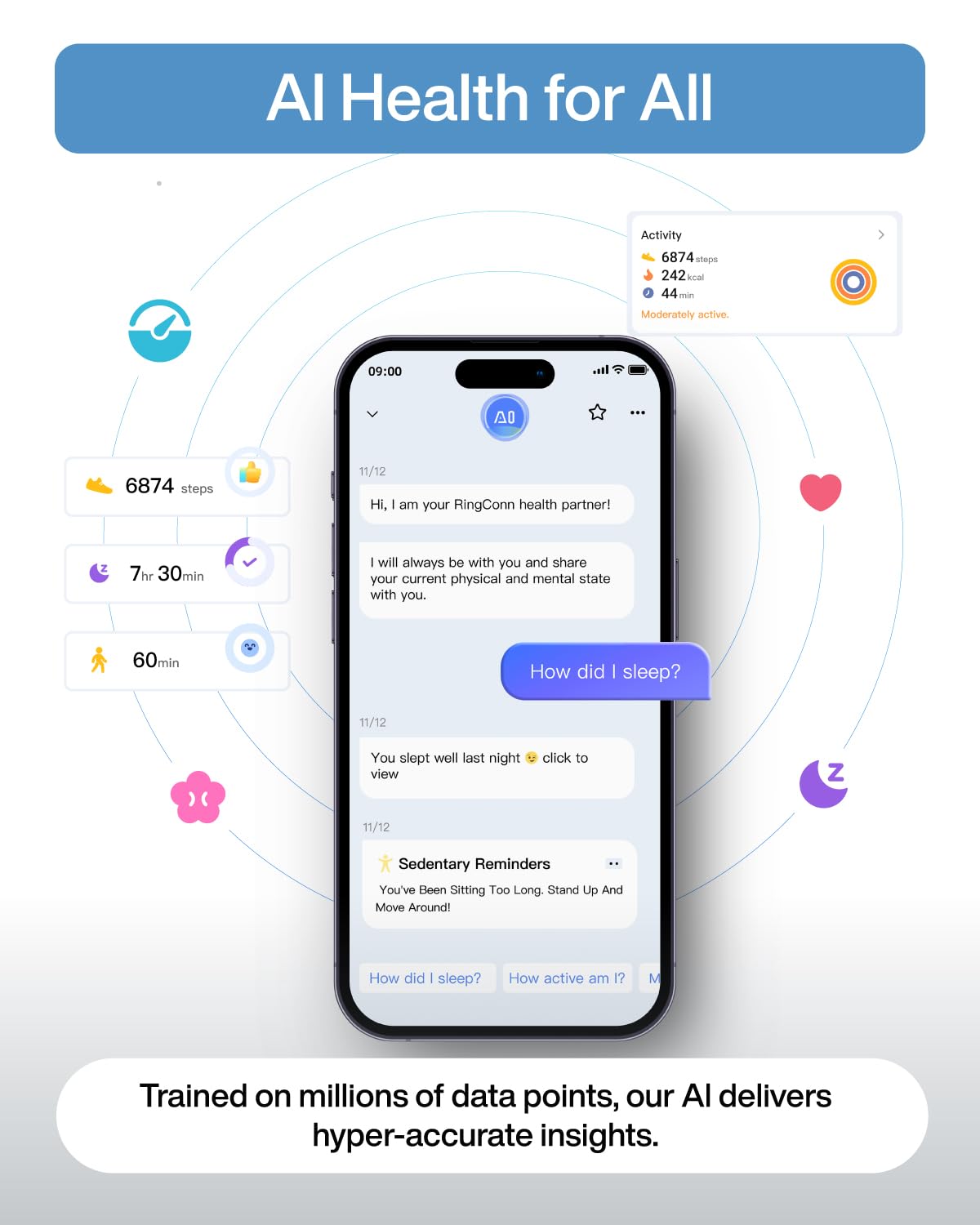 - [AI-potenziato analisi intelligenti] RingConn Gen 2 Air Smart Ring integra AI con dati multi-sensoriali per tracciare continuamente metriche di salute chiave come sonno, frequenza cardiaca, livelli di stress, ossigeno nel sangue, attività fisica e cicli mestruali. Il suo assistente AI integrato fornisce un rapporto personalizzato e una guida per migliorare il tuo benessere e le abitudini quotidiane