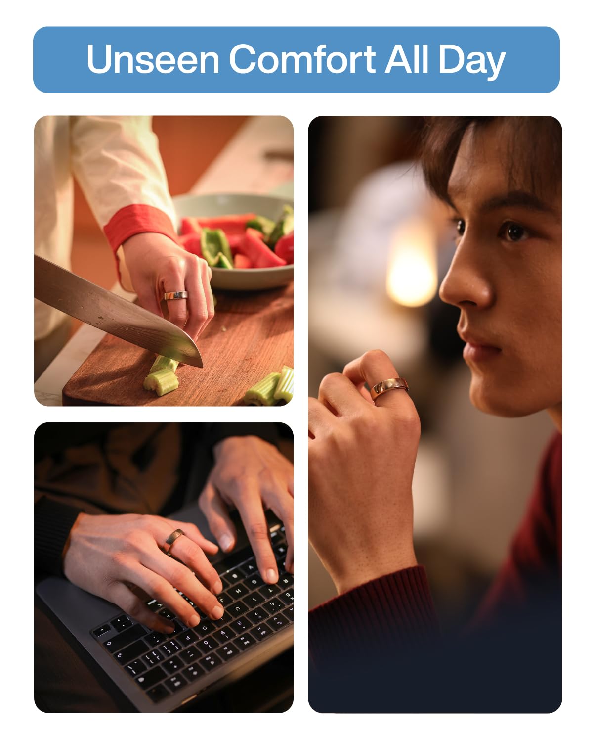 - [Indossare senza sentire] Prova un design comodo ed elegante con un profilo super sottile da 2 mm e un peso di soli 2,5 g. Non interferirà con i tuoi movimenti, che tu stia allenandoti, correndo, tuffandoti o svolgendo qualsiasi attività fisica, e rimarrà comodo senza distrarti quando dormi o lavori